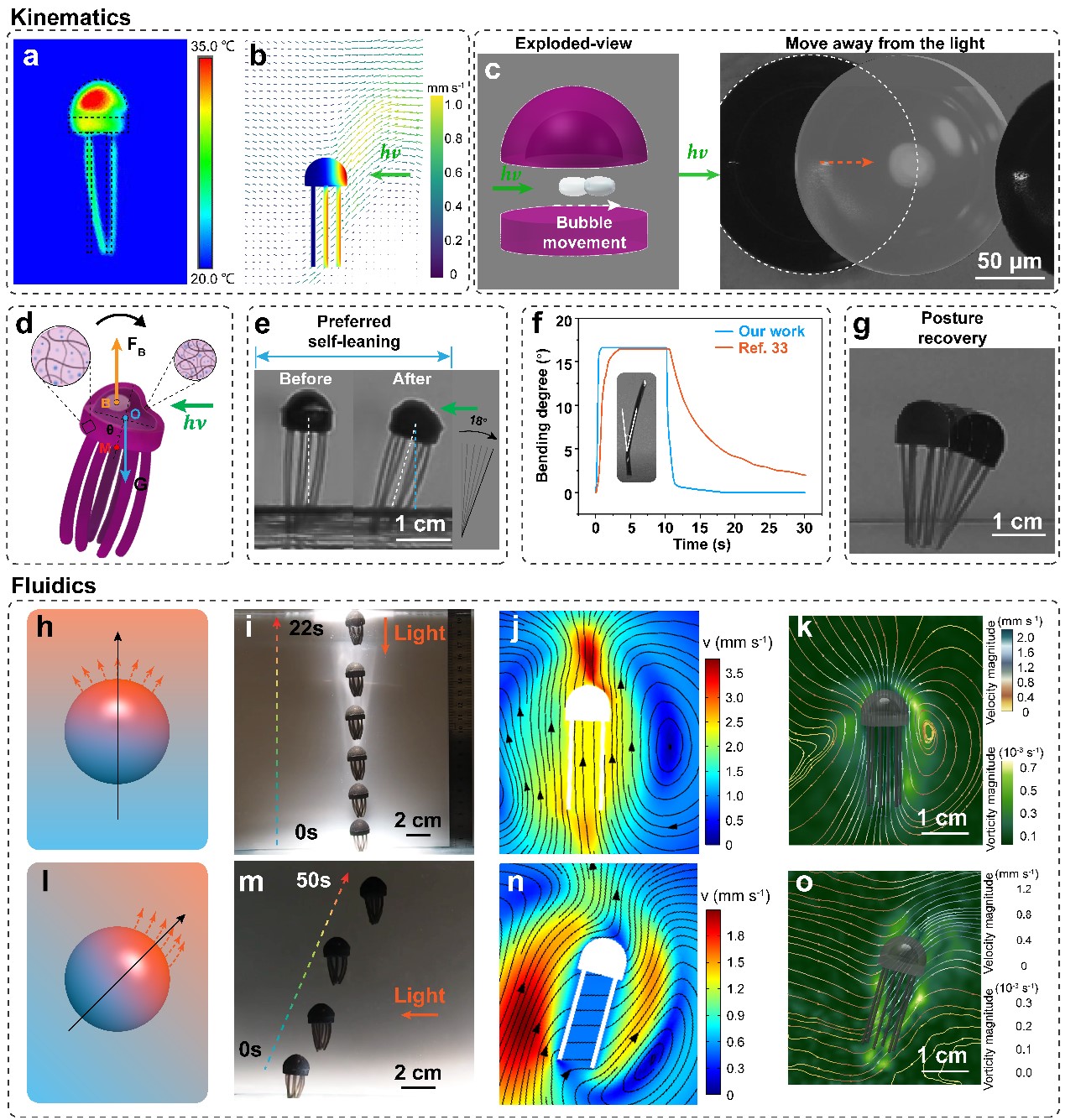 一旦受到光照,PTV的三種非對稱特性同時被激發(fā),從而形成新的溫度梯度、流場梯度和機械應(yīng)變梯度(圖2a-d)。為了實現(xiàn)長期且對等的驅(qū)動和恢復(fù),作者通過控制材料制備的化學(xué)和物理過程來改變凝膠的孔隙度。在16°的角度下,冰模板輔助下混合交聯(lián)的水凝膠柱在不到一秒的時間內(nèi)完全恢復(fù)原狀(圖2f),其恢復(fù)速度與其收縮速度相當,比之前報道的最佳值快了30倍。PTV中內(nèi)嵌的光熱響應(yīng)材料r-GO和AuNPs有效地將光能轉(zhuǎn)化為熱能,當從上方照射光線時,PTV迅速上升至水面(圖2i)。表面的溫升引發(fā)向上的對流,傳遞了方向信息(圖2j)。PIV測試結(jié)果與CFD模擬結(jié)果相當吻合(圖2j、k)。水平光照時,右側(cè)的水平輻照引起溫度和流場的非對稱性,在光照一側(cè)產(chǎn)生更高的溫度和流速(圖2o)。被加熱的表面反映了入射光的方向信息,但也會引發(fā)上升流,使PTV向右上方移動(圖2m)。CFD和PIV結(jié)果(圖2n、o)表明,流場中的大部分是向上對流,這可能導(dǎo)致水平光線照射時的準確性降低(圖2m)。