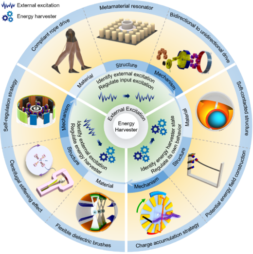 近日,上海交通大學機械與動力工程學院張文明教授團隊、湖南工程學院魏克湘教授團隊和西北工業(yè)大學周生喜教授團隊聯(lián)合在Advanced Energy Materials (IF=29.698)上發(fā)表綜述論文“Mechanical intelligent energy harvesting: From methodology to applications”,并入選編輯精選。論文為解決能量采集系統(tǒng)對復雜環(huán)境與工況的適應(yīng)性難題,提出了機械智能能量采集概念,闡明了機械智能能量采集設(shè)計方法論,綜述了具有機械智能特征的能量采集系統(tǒng)典型設(shè)計,預(yù)測了機械智能能量采集的未來發(fā)展趨勢。趙林川博士后為本文第一作者,張文明教授、湖南工程學院鄒鴻翔教授和西北工業(yè)大學周生喜教授為通訊作者。
