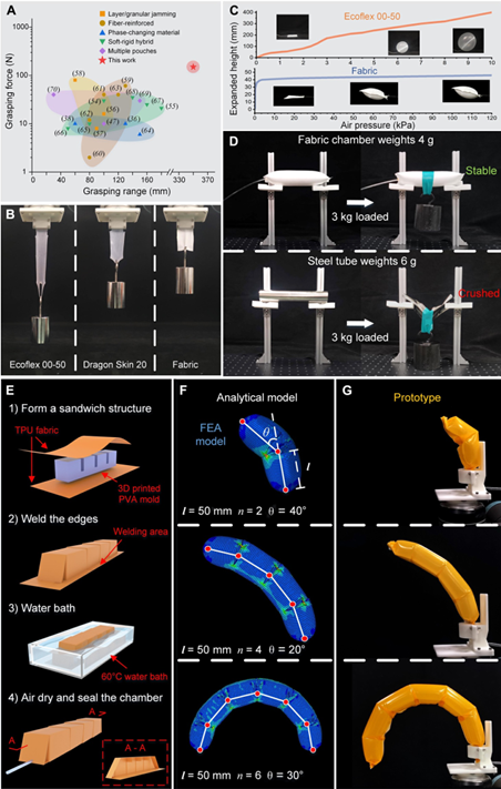 近日,上海交通大學機械與動力工程學院王皓、陳根良團隊在Science Advances上發(fā)表“Soft and lightweight fabric enables powerful and high-range pneumatic actuation”論文,其開發(fā)的“基于織物的輕質(zhì)高強度機器人/機械手”突破了傳統(tǒng)柔性機器人柔順性與承載能力相互制約的瓶頸,通過發(fā)揮織物材料柔軟且抗拉伸的獨特性能,突破現(xiàn)有基于硅橡膠制作柔性機器人的思維慣性,提出具有運動模式可任意編程的輕質(zhì)高強度柔性驅(qū)動單元。該機器人單元同時具備結(jié)構(gòu)順應性、交互友好性以及承載強、質(zhì)量輕、精度高、工作空間大等優(yōu)點,將剛性與柔性機器人各自的優(yōu)點有機結(jié)合。陳根良教授與西湖大學工學院姜漢卿教授為本文共同通訊作者,上海交通大學博士畢業(yè)生、西湖大學博士后張壯和上海交通大學博士生龍泳舟為共同第一作者。