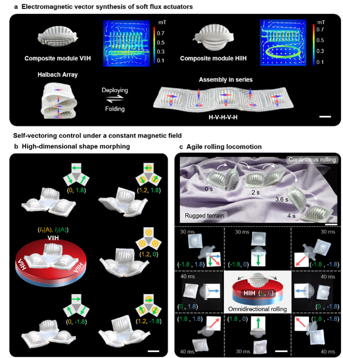 研究團(tuán)隊(duì)利用嵌入的液態(tài)金屬制造出可重構(gòu)的兩類典型的軟電磁線圈,即具有垂直電磁矢量的平面螺旋線圈和具有水平電磁矢量的三維可重構(gòu)螺線管線圈。通過不同重構(gòu)策略將兩類基本模塊復(fù)合疊加,實(shí)現(xiàn)了三維空間內(nèi)任意方向的矢量合成。模塊化的“自矢量機(jī)器人”通過簡單的電流控制即可實(shí)現(xiàn)即時高效的可重新編程、獨(dú)立的子域驅(qū)動和全方向的矢量操控,通過最少數(shù)量的驅(qū)動器展示了更高維度的變形和運(yùn)動。研究分別實(shí)現(xiàn)了單驅(qū)動器和單路控制信號的適應(yīng)復(fù)雜地形的連續(xù)翻滾和雙向翻滾運(yùn)動,以及兩個驅(qū)動器和兩路控制信號控制的全向翻滾運(yùn)動和平面全向定位操控;展示了無需復(fù)雜多源控制和輔助設(shè)備,而僅通過兩路電流信號控制的高維可重編程形狀變形;另外實(shí)現(xiàn)了仿蠕蟲的雙向爬行和轉(zhuǎn)向,以及翻滾、全向爬行及原位旋轉(zhuǎn)等運(yùn)動,并且展示了集成控制系統(tǒng)的無拖纜水面游動和自帶磁鐵的水下游動。“自矢量”策略將為人機(jī)交互、醫(yī)療應(yīng)用、主動超材料等領(lǐng)域帶來新的啟發(fā)。