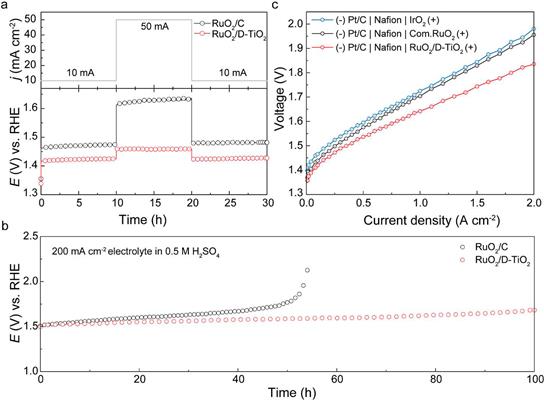 DFT理論計算表明,RuO2(110)/D-TiO2模型表面由基于Eley–Rideal路徑的AEM反應(yīng)機制占主導(dǎo),從而規(guī)避了LOM機制對于RuO2晶格結(jié)構(gòu)的破壞及活性位點的流失;且RuO2(110)/D-TiO2相較無缺陷的TiO2 負載催化劑及RuO2 (110)模型表面,OER的限制電勢 (UL) 最低,從理論上揭示了酸性O(shè)ER高活性的原因。此外,所制備的RuO2/D-TiO2催化劑在三電極OER測試中,達到10 mA cm−2時僅需180 mV的過電位,PEMWE單體測試中2 A cm−2時電解槽槽壓僅為1.84 V,能量轉(zhuǎn)化效率達68.1%;且在200 mA cm−2下穩(wěn)定電解超過100 h。