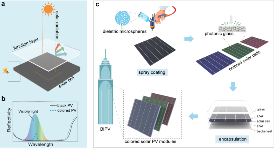 高效彩色光伏是推動(dòng)建筑集成一體化光伏 (building-integrated photovoltaics, BIPV)大規(guī)模發(fā)展、實(shí)現(xiàn)零能耗建筑的重要技術(shù)。為此,需要采用對(duì)太陽輻射具有高透過率的材料并產(chǎn)生結(jié)構(gòu)色。目前所采用的方法主要基于具有嚴(yán)格周期性的光子晶體以及光柵等結(jié)構(gòu),難以低成本規(guī)模化制備,這嚴(yán)重制約了高效彩色光伏的發(fā)展。本研究在單晶硅電池片上成功制備了基于分散介電微球的光子玻璃層,利用光子玻璃的選擇性光學(xué)反射特性實(shí)現(xiàn)了低效率損失,同時(shí)基于其自組裝特性實(shí)現(xiàn)了快速低成本制作,為高效彩色光伏的低成本制備提供了一種新的技術(shù)路徑。