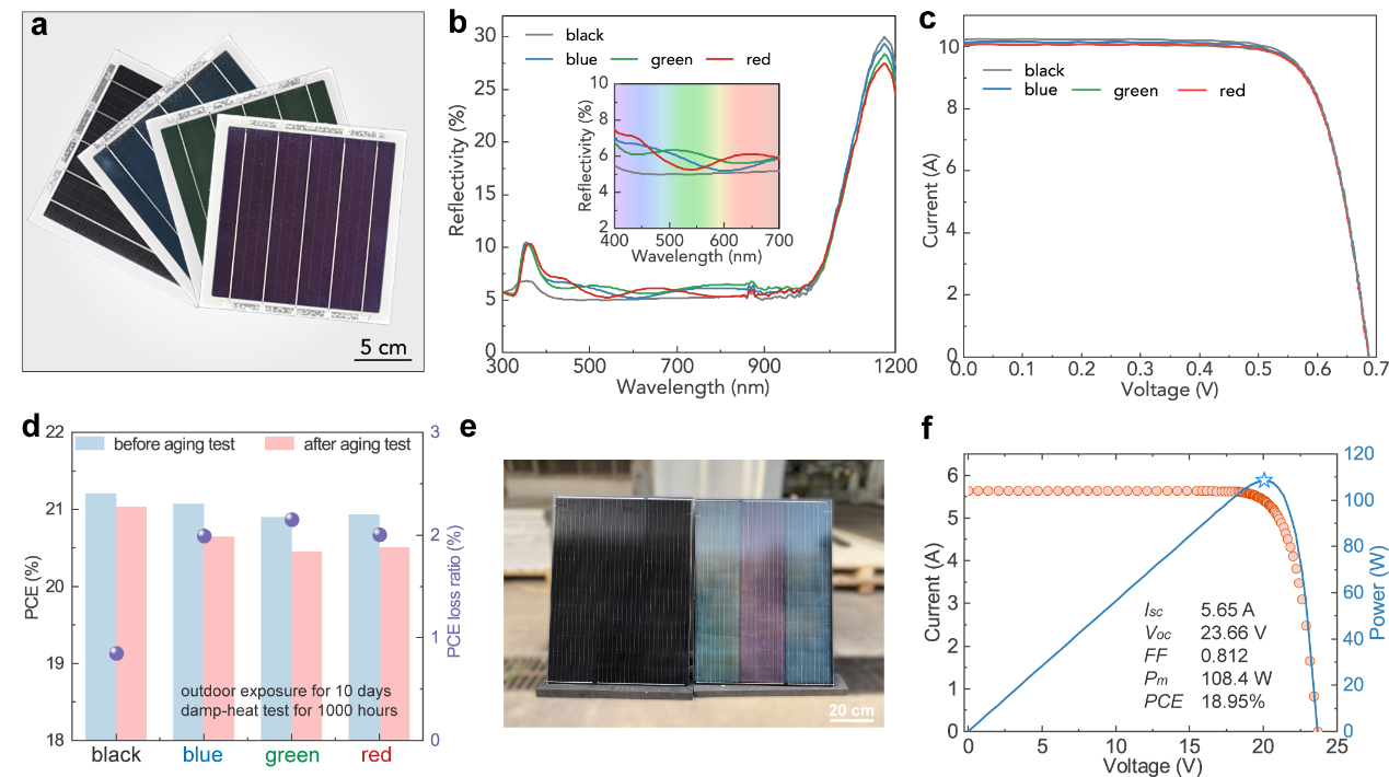 論文對(duì)光子玻璃在光伏電池上的自組裝過程、顏色產(chǎn)生機(jī)理及其對(duì)電池效率的影響等進(jìn)行了分析,并展示了具有不同色調(diào)、且效率相對(duì)損失低于5%的彩色電池片。研究人員采用與商業(yè)化組件同樣的封裝設(shè)備與過程,制作了效率超過21%的彩色光伏組件,并通過加速老化測(cè)試驗(yàn)證了其長(zhǎng)期穩(wěn)定性。通過展示全尺寸組件(輸出功率大于108 W) 以及更高亮度的彩色光伏組件,論文進(jìn)一步證明了該技術(shù)在實(shí)際應(yīng)用中的可行性。