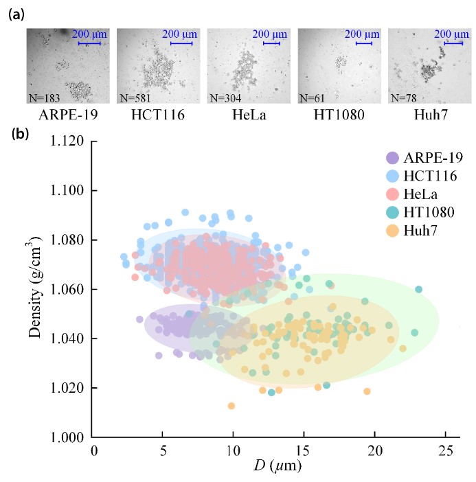 為了驗證方法有效性,論文分別對來自不同譜系的細胞進行密度表征。結(jié)果表明,相比于正常細胞,癌細胞在細胞密度與尺寸方面具有顯著的細胞異質(zhì)性。此外,該方法也可實現(xiàn)不同濃度藥物(吉非替尼)作用下肺癌細胞(A549)的密度檢測,為癌細胞異質(zhì)性表征及藥物作用效果評估提供了潛在的技術支撐。