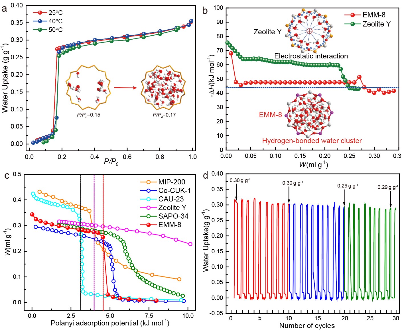 新型磷酸鋁分子篩材料的骨架結(jié)構(gòu)由雙4環(huán)、12元環(huán)和8元環(huán)的通道組成,在700度下依然保持良好的水熱穩(wěn)定性。通過(guò)實(shí)驗(yàn)測(cè)試發(fā)現(xiàn)該材料展現(xiàn)了完美的“S形”水吸附等溫曲線和極低的吸附焓值(47kJ/mol),吸附階躍轉(zhuǎn)變相對(duì)壓力為0.15~0.17、飽和吸附量為0.35 g/g。作者通過(guò)分子動(dòng)力學(xué)理論計(jì)算,闡明了新型SFO磷酸鋁材料的吸附特性,并明晰了其吸附機(jī)理,發(fā)現(xiàn)SFO材料內(nèi)部形成的弱氫鍵網(wǎng)絡(luò)是實(shí)現(xiàn)其低吸附焓值的根本原因。該材料在低溫?zé)嵩矗▇63°C)驅(qū)動(dòng)下表現(xiàn)出了極為優(yōu)異的制冷性能系數(shù)(COP=0.85),為目前國(guó)內(nèi)外已有報(bào)道的最高數(shù)值之一,且新型SFO磷酸鋁材料展現(xiàn)出了極快的吸附/脫附動(dòng)力學(xué)性能,在5°C蒸發(fā)溫度與65°C脫附溫度工況下,單位質(zhì)量吸附劑的制冷功率可達(dá)到1.1kW/kg,超過(guò)了商用吸附劑和現(xiàn)有報(bào)道的MOFs吸附材料,且原材料成本僅為MOFs材料的百分之一,具有極大的商業(yè)化應(yīng)用價(jià)值。