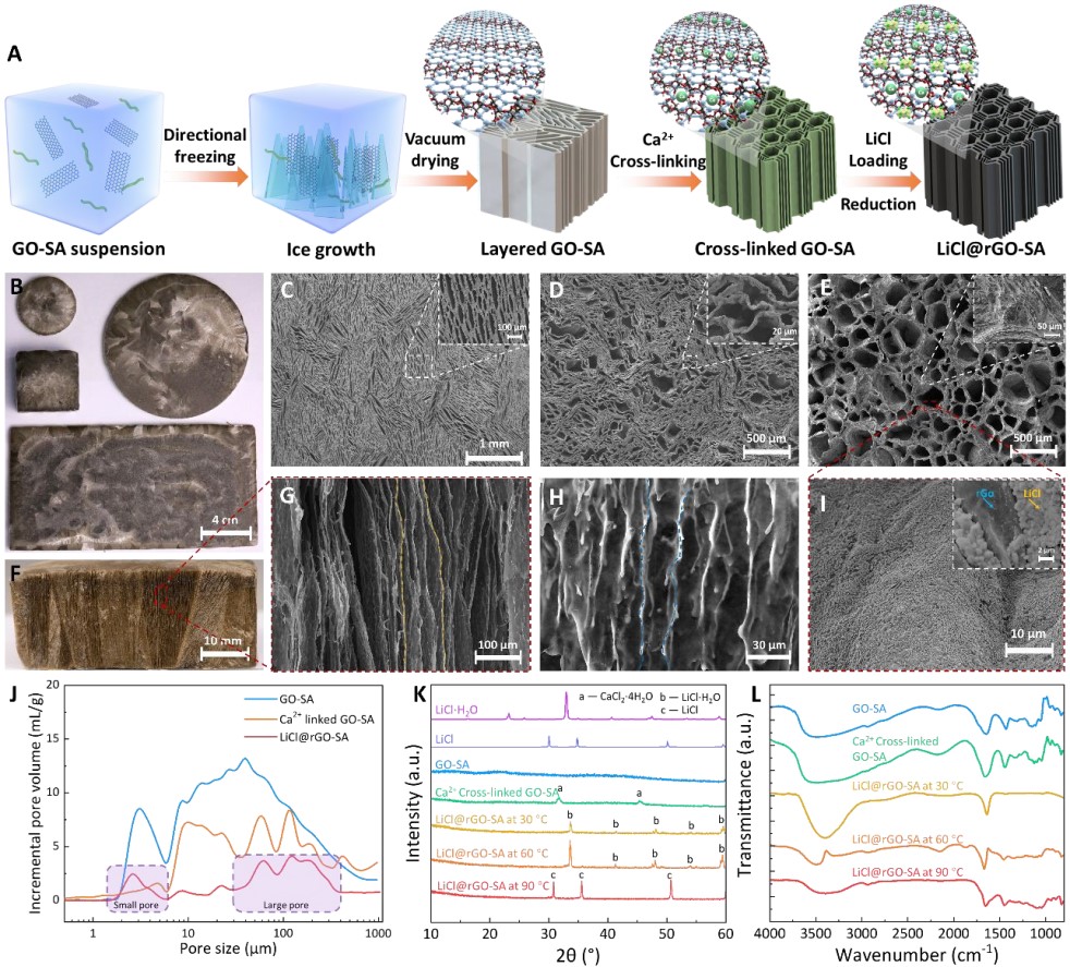 圖1 垂直陣列石墨烯水凝膠基復(fù)合吸附劑(LiCl@rGO-SA)的合成與結(jié)構(gòu)表征