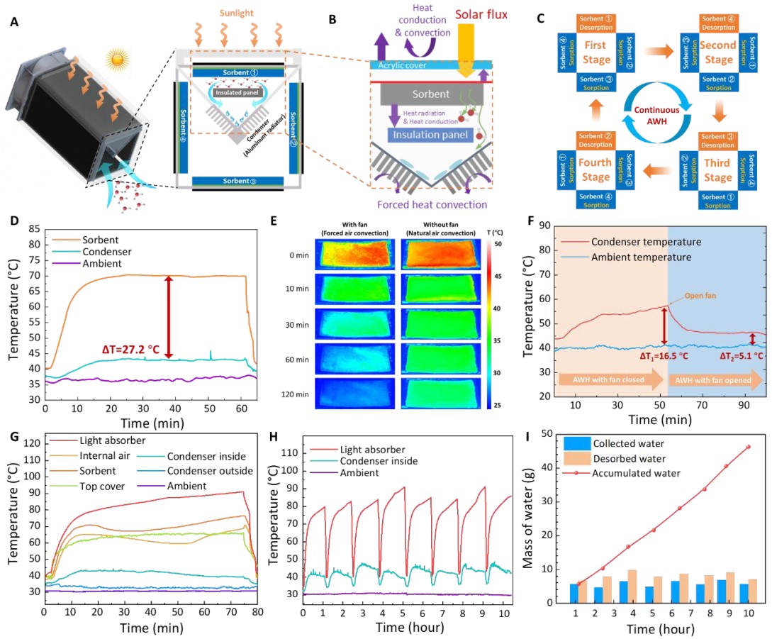 為了解決傳統(tǒng)間歇式空氣取水器工作過程中吸附階段不能產(chǎn)水的弊端和單日僅能實(shí)現(xiàn)單次吸附-解吸取水循環(huán)的局限,文章開發(fā)設(shè)計(jì)了一種采用多吸附床切換式的連續(xù)空氣取水策略。引入強(qiáng)制對(duì)流,一方面強(qiáng)化了水分子從環(huán)境傳輸至吸附劑孔道的傳質(zhì)速率,另一方面帶走了吸附劑吸附產(chǎn)生的吸附熱,從而促進(jìn)了吸附劑的吸附速率,同時(shí)流經(jīng)冷凝器翅片帶走了水蒸氣釋放的冷凝熱,一舉多得實(shí)現(xiàn)了空氣取水裝置的傳熱傳質(zhì)協(xié)同強(qiáng)化。文章構(gòu)建的半主動(dòng)式快速循環(huán)連續(xù)空氣取水器可以實(shí)現(xiàn)一天8次的吸附-脫附取水循環(huán),室內(nèi)太陽(yáng)能模擬工況下取水量達(dá)到2120 mLwater/kgsorbent/day,戶外低濕度工況的太陽(yáng)能取水實(shí)驗(yàn)表明在超過35°C的高溫外界環(huán)境中實(shí)現(xiàn)了1050 mLwater/kgsorbent/day的取水量。該工作為實(shí)現(xiàn)緊湊、便攜、規(guī)模化的高效空氣取水器提供了新思路。