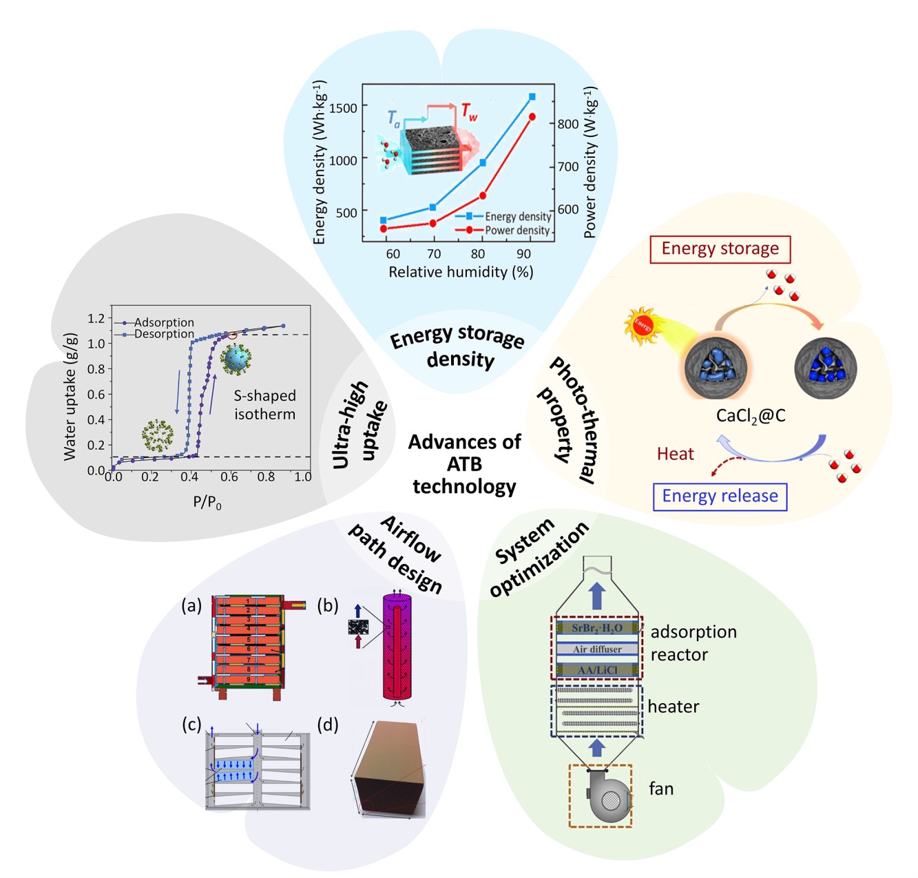降低建筑采暖碳排放已成為當(dāng)今能源、環(huán)境、建筑領(lǐng)域的熱門研究方向。在眾多建筑采暖方法中,與儲熱技術(shù)相結(jié)合的被動式太陽能供熱技術(shù)因其不完全依賴于電力系統(tǒng)、零能耗、建筑一體化結(jié)構(gòu)設(shè)計等優(yōu)點,受到了國內(nèi)外學(xué)術(shù)界的廣泛關(guān)注。目前,在面向建筑采暖的儲熱領(lǐng)域中,主流的儲熱技術(shù)包括顯熱儲熱和相變儲熱,這些儲熱技術(shù)主要存在儲熱密度低、熱損明顯的缺陷。相比之下,基于熱化學(xué)可逆反應(yīng)的吸附儲熱技術(shù)通過利用吸附劑和吸附質(zhì)間化學(xué)勢能或分子勢能與熱能的轉(zhuǎn)化,可實現(xiàn)超高儲熱密度、長周期(跨季節(jié))、安全可控的儲熱過程,被認(rèn)為是建筑節(jié)能和低品位熱能利用領(lǐng)域內(nèi)最具潛力的技術(shù)之一。然而,前期的研究著重關(guān)注材料本身的吸附、解吸特性,忽略了材料成本、穩(wěn)定安全以及系統(tǒng)性能、結(jié)構(gòu)設(shè)計等方面的總體影響。
