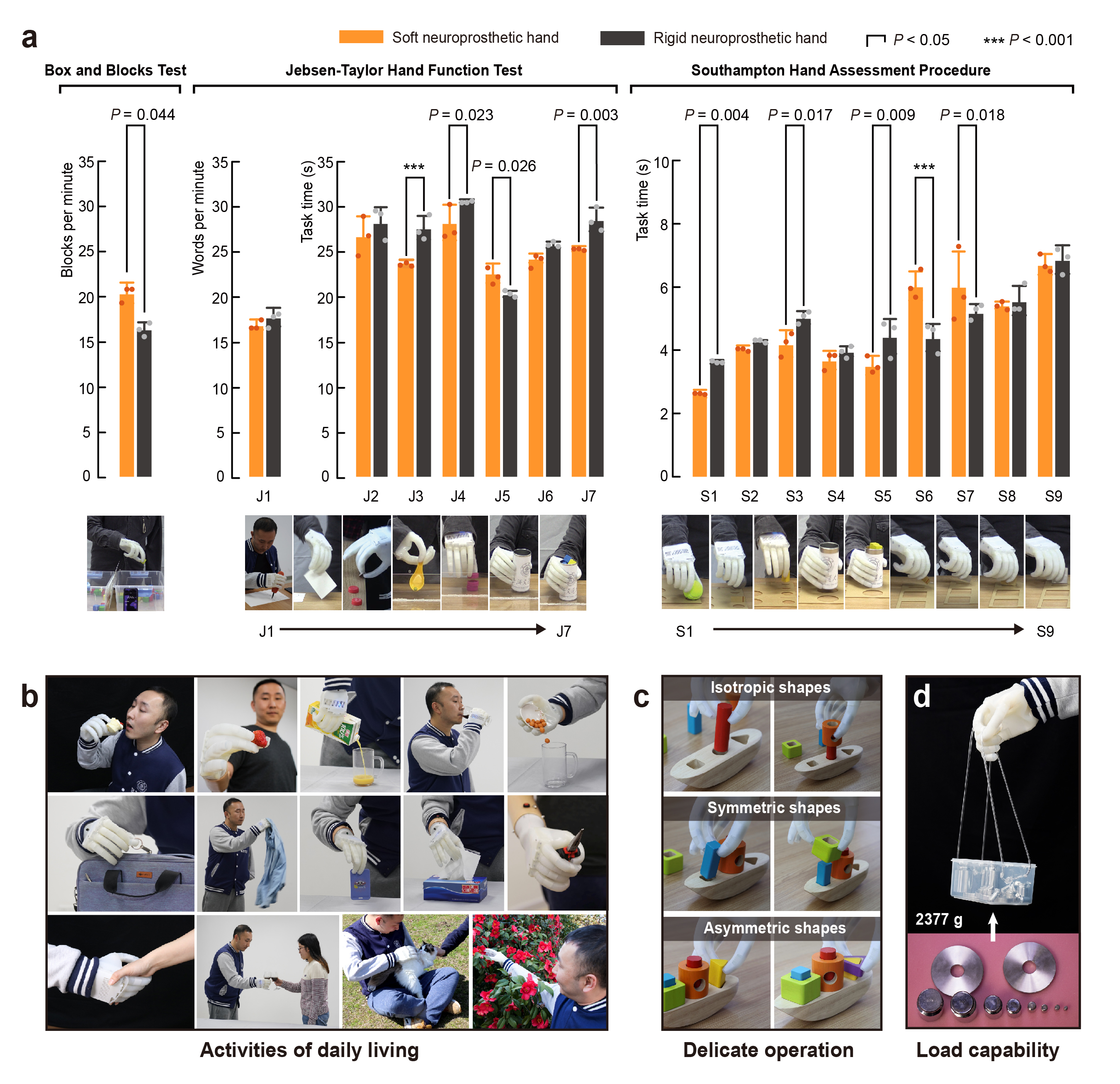 為了評估軟體神經(jīng)假肢手的使用性能,兩位截肢患者按指定范式分別完成了軟體假肢手和剛性假肢手的標準量化測試實驗。實驗結果統(tǒng)計分析表明,軟體假肢手在速度和靈巧性方面優(yōu)于傳統(tǒng)的剛性神經(jīng)假肢。當抓握草莓、面包和紙杯等柔軟、易碎物品時,軟體神經(jīng)假肢手展示了更強的性能優(yōu)勢。此外,因軟體假肢手重量大幅降低,受試者佩戴使用的舒適性明顯提升。