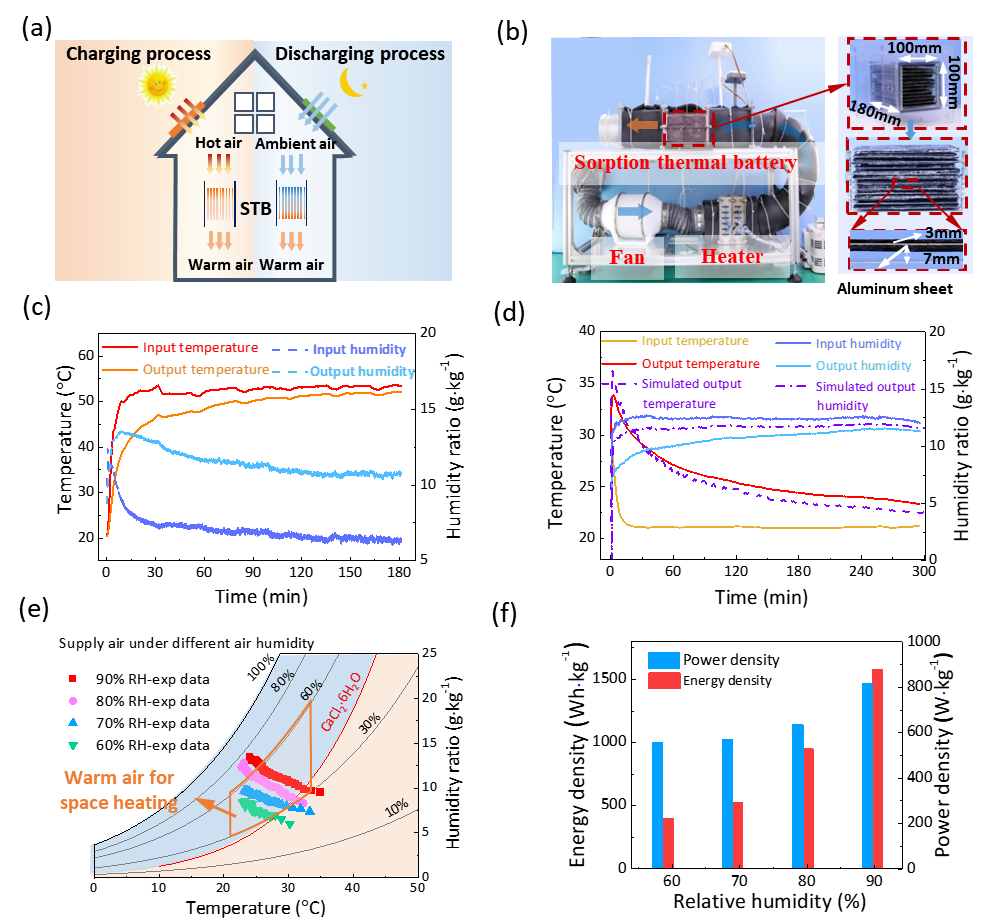 研究工作提出了從空氣中取能實(shí)現(xiàn)超高能量密度儲(chǔ)熱的吸附熱池,采用“水熱合成-溶液浸漬法”制備了石墨烯氣凝膠復(fù)合吸附材料,利用石墨烯氣凝膠的高孔隙率特性和三維多孔骨架結(jié)構(gòu)提高了反應(yīng)鹽的吸附-解吸傳質(zhì)性能,實(shí)現(xiàn)了反應(yīng)鹽固-氣化學(xué)吸附、固-液潮解和溶液吸收的多步耦合,具有鹽負(fù)載量高(96 wt%)、吸附量大(2.89 g·g-1)、吸附速率快和穩(wěn)定性好的優(yōu)勢。在此基礎(chǔ)上采用模塊化石墨烯氣凝膠復(fù)合吸附劑,構(gòu)建了從空氣中取能的吸附熱池,通過耦合儲(chǔ)熱過程的熱能梯級利用與放熱過程的熱能提質(zhì)利用,實(shí)現(xiàn)了吸附熱池向外界的連續(xù)供熱,儲(chǔ)熱能量密度高達(dá)1580 Wh·kg-1、功率密度達(dá)815 W·kg-1,該工作為低碳高效、高能量密度、高功率密度的熱能收集、儲(chǔ)存和利用提供了新思路。