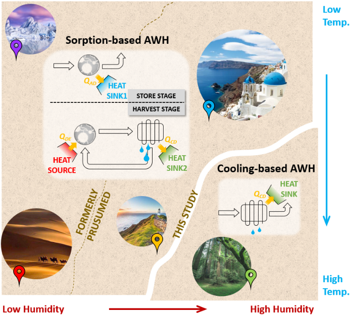 能源與水是21世紀的重要議題,發(fā)展高效節(jié)能的取水技術(shù)至關(guān)重要。在眾多取水方法中,空氣取水技術(shù)因其不依賴于水源、適應(yīng)性廣和輕便潔凈等特性而引起了國內(nèi)外學(xué)者的普遍關(guān)注。利用蒸汽壓縮式系統(tǒng)進行冷凝取水的技術(shù),已經(jīng)達到商業(yè)化水準,但在一些缺水的內(nèi)陸地區(qū),冷凝取水所需的露點溫度很低,使得構(gòu)造相應(yīng)冷源的能耗居高不下。同時受到水冰點的限制,冷凝取水在空氣露點低于零度的地區(qū)難以適用。另一方面,吸附劑具有豐富的納米級孔道結(jié)構(gòu),可在高溫下富集水蒸氣,有效提高空氣露點,解決冷凝取水技術(shù)的困境,適應(yīng)干燥地區(qū)取水的需求。近年來,已有研究針對吸附取水技術(shù)進行了大量的材料創(chuàng)新和可行性驗證,然而,兩種取水技術(shù)的能耗水平及其各自的適用邊界并沒有被明確劃分,從而導(dǎo)致不同研究的測試工況和能耗評價方法難以統(tǒng)一。