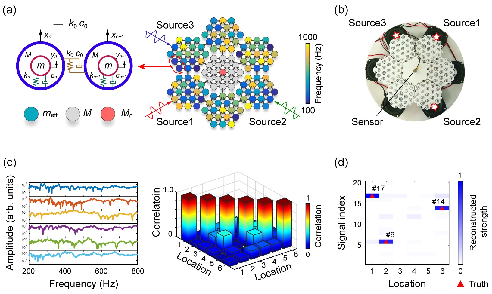 在自然界,蜘蛛可以靈敏感知和定位落在蛛網(wǎng)上昆蟲的振動(dòng)。像蜘蛛一樣利用傳感器對(duì)遠(yuǎn)處的振動(dòng)激勵(lì)進(jìn)行感知和定位即為振動(dòng)溯源,在醫(yī)療健康監(jiān)測(cè)、機(jī)器故障診斷、智能設(shè)備和物聯(lián)網(wǎng)等領(lǐng)域具有重要的應(yīng)用價(jià)值。傳統(tǒng)的振源辨識(shí)技術(shù)通常依賴于多個(gè)分布式傳感器或傳感器網(wǎng)絡(luò),測(cè)試系統(tǒng)復(fù)雜且功耗較高。為了突破傳統(tǒng)振源辨識(shí)技術(shù)受傳感器數(shù)量限制的瓶頸難題,何清波教授等人利用超材料結(jié)構(gòu)的原理,提出了振動(dòng)傳遞特性設(shè)計(jì)和調(diào)控的思想。超材料是一種自然界不存在的人工復(fù)合材料,具有超常的動(dòng)力學(xué)特性。一般超材料具有周期性復(fù)合結(jié)構(gòu),比如局域共振超材料,但是周期性超材料結(jié)構(gòu)難以對(duì)來自多個(gè)方位的振動(dòng)傳遞特性進(jìn)行靈活調(diào)控。研究人員提出了隨機(jī)耦合振子動(dòng)力學(xué)理論,建立了一種融入等效負(fù)質(zhì)量特性的動(dòng)力學(xué)分析方法,以此指導(dǎo)設(shè)計(jì)了隨機(jī)耦合局域共振超材料結(jié)構(gòu)模型,該模型包含多個(gè)具有隨機(jī)共振頻率且無序耦合的局域振子。研究發(fā)現(xiàn),該超材料結(jié)構(gòu)模型局域振子等效質(zhì)量的隨機(jī)分布與耦合導(dǎo)致了彈性振動(dòng)傳播的復(fù)雜性,產(chǎn)生了高度不相關(guān)的空間振動(dòng)傳遞特性,這形成了振動(dòng)傳遞特性編碼設(shè)計(jì)的物理機(jī)制。研究人員進(jìn)而利用振動(dòng)傳遞編碼特性構(gòu)造了壓縮感知算法的觀測(cè)矩陣,僅利用一個(gè)振動(dòng)傳感器的測(cè)量信號(hào),實(shí)現(xiàn)了對(duì)多源寬帶振動(dòng)激勵(lì)的高精度辨識(shí),并且證明了該方法具有噪聲魯棒性。該超材料結(jié)構(gòu)形式具有靈活的單元可重構(gòu)性,可以滿足不同的應(yīng)用場(chǎng)合需求。