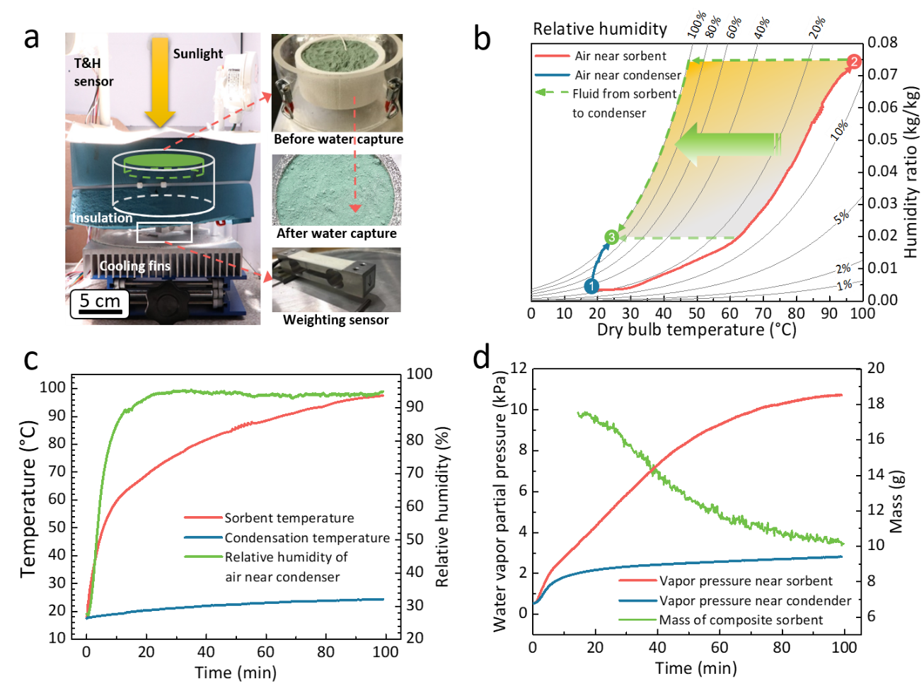 研究團(tuán)隊(duì)將制備的復(fù)合吸附材料應(yīng)用在空氣取水裝置中,實(shí)現(xiàn)了在低相對濕度條件下,從干燥空氣中快速吸附捕捉水蒸汽與自然光照下的加熱脫附收集。該裝置單次循環(huán)的空氣取水量高達(dá)0.45~0.70 kg/kg,高于目前國際頂級期刊的報(bào)道數(shù)據(jù),該方法有望推動(dòng)基于吸附材料的空氣取水技術(shù)的發(fā)展與商業(yè)化應(yīng)用。
