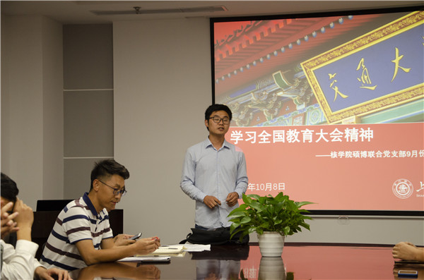10月9日,核學(xué)院碩博聯(lián)合黨支部在機(jī)械樓F210開展了“學(xué)習(xí)全國教育大會(huì)精神”主題組織生活會(huì)。會(huì)議由博士生黨支部書記賴平主持,核學(xué)院思政老師余天佐出席了本次組織生活會(huì),碩博聯(lián)合黨支部的黨員和部分積極分子參與了本次會(huì)議的學(xué)習(xí)和討論。