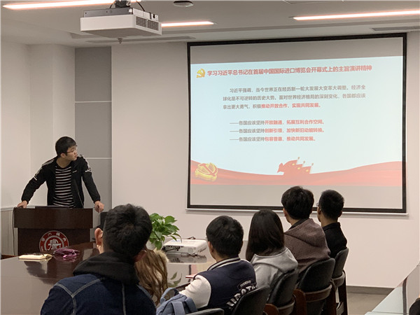 接下來(lái)是黨員發(fā)言討論環(huán)節(jié),2017級(jí)碩士研究生國(guó)正說(shuō):“中國(guó)第一次舉辦以進(jìn)出口為主題的博覽會(huì),是世界創(chuàng)舉,這是中國(guó)推動(dòng)建設(shè)開(kāi)放型世界經(jīng)濟(jì)、支持經(jīng)濟(jì)全球化的實(shí)際行動(dòng)。”