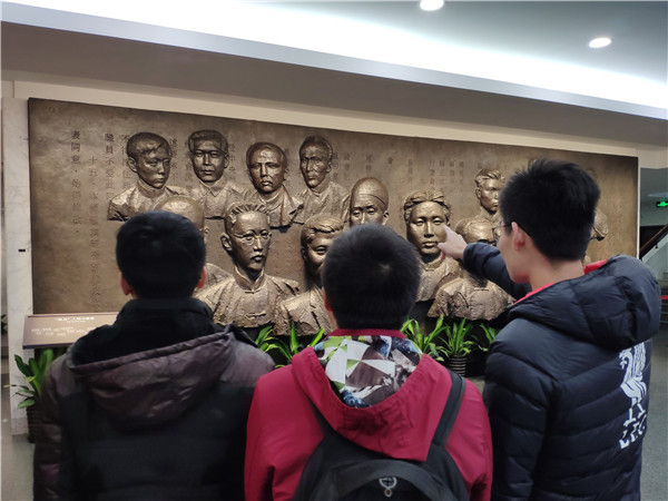 同學們秩序井然地入場,抬頭便是巨幅銅質浮雕像,建黨先驅們如炬的目光,瞬間令參觀者重回那個戰(zhàn)火紛飛的年代,喚起了大家對建黨初期坎坷歷史的點滴記憶。