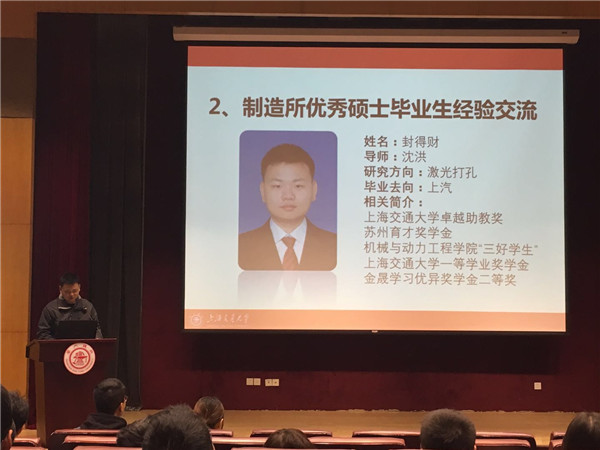 會議開始后,許黎明代表制造所全體老師為畢業(yè)生們寄語未來,他殷切希望即將畢業(yè)的制造所同學(xué)在未來的工作與科研生活不忘初心,勇于擔(dān)當(dāng),求真務(wù)實,腳踏實地,胸懷祖國,放眼世界,為社會做出自己的貢獻,為上海交通大學(xué)機動學(xué)院爭光。