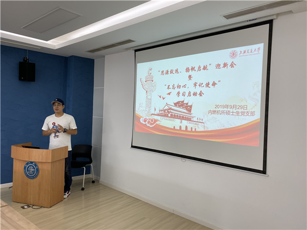 今年開學(xué)后內(nèi)燃機(jī)研究所碩士生黨支部迎來了2019級(jí)新成員,鄧康耀首先在會(huì)上主持了名為“思源致遠(yuǎn),揚(yáng)帆起航”的新生主題黨課。在講話中,鄧康耀結(jié)合自身學(xué)習(xí)奮斗經(jīng)歷以及當(dāng)前國(guó)家經(jīng)濟(jì)形勢(shì),從國(guó)家、學(xué)校以及個(gè)人多個(gè)層面進(jìn)行了分析和講解,勉勵(lì)在座各位同學(xué)珍惜年華,努力學(xué)習(xí),下真功夫,學(xué)真本領(lǐng),努力成為一個(gè)對(duì)國(guó)家和社會(huì)有貢獻(xiàn)的人。
