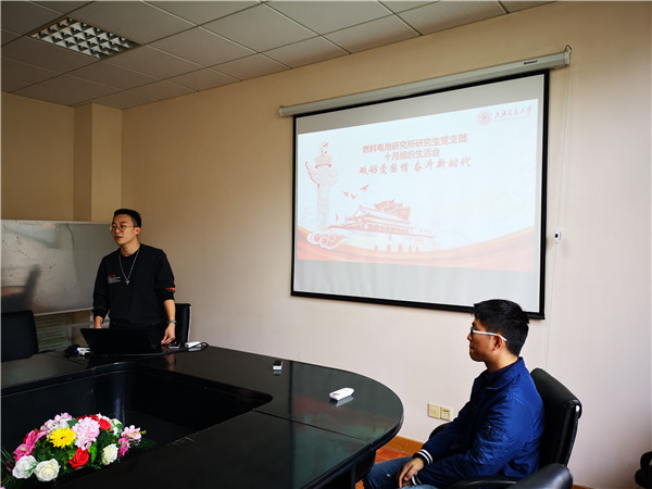 10月18日中午,燃料電池研究所研究生黨支部在曾憲梓樓202會議室召開了十月組織生活會,主題是“砥礪愛國情,奮斗新時代”,會議由黨支部書記范月恒主持。