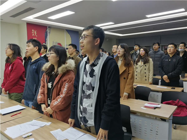 首先開始的黨員轉(zhuǎn)正大會(huì)在全體奏唱的國歌聲中拉開序幕。組織委員張怡潔先依次對(duì)儲(chǔ)鵬和鄭思航兩位預(yù)備黨員的基本信息作以介紹,之后邀請(qǐng)兩位同志上臺(tái)匯報(bào)自己的預(yù)備期表現(xiàn)情況。隨后兩位預(yù)備黨員的預(yù)備期考察人分別上臺(tái)介紹有關(guān)情況。最后,馮耀輝代表支委會(huì)對(duì)儲(chǔ)鵬和鄭思航兩位同志給出中肯評(píng)價(jià),他表示,兩位同志在預(yù)備期內(nèi),都能以黨員的標(biāo)準(zhǔn)嚴(yán)格要求自己,起到黨員模范帶頭作用。與會(huì)黨員發(fā)表意見后,支部大會(huì)經(jīng)無記名投票表決,一致同意儲(chǔ)鵬、鄭思航轉(zhuǎn)為正式黨員。兩位轉(zhuǎn)正對(duì)象依次上臺(tái)進(jìn)行表態(tài)發(fā)言。