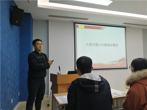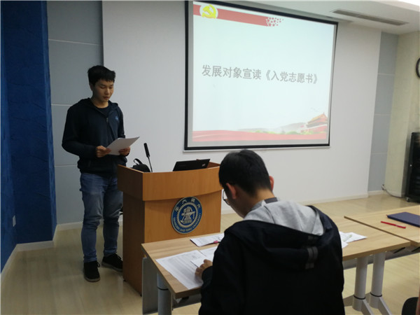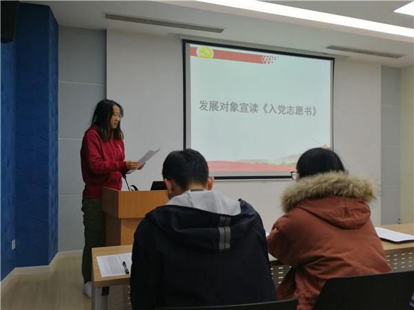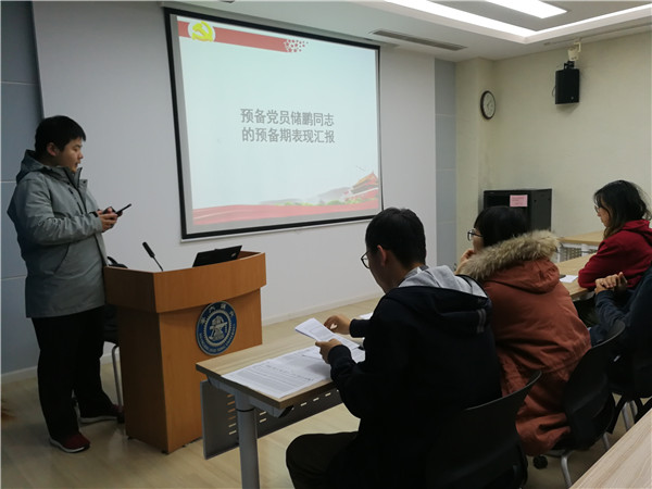 接著進(jìn)行黨員發(fā)展大會(huì),組織委員張怡潔分別介紹了鄒震峰和杜懿岑兩位同學(xué)的入黨信息、學(xué)習(xí)工作志愿等基本情況以及支部評(píng)價(jià),隨后邀請(qǐng)發(fā)展對(duì)象上臺(tái)宣讀《入黨志愿書》。在入黨介紹人介紹有關(guān)情況后,支委會(huì)綜合考慮鄒震峰和杜懿岑同學(xué)日常表現(xiàn)、考察人意見、群眾座談會(huì)意見和導(dǎo)師意見,認(rèn)為兩位同學(xué)在黨性修養(yǎng)、科研工作以及日常生活中都表現(xiàn)良好,基本符合黨員條件。與會(huì)黨員也表達(dá)了自己的意見,紛紛表示贊同支委會(huì)的考察意見。經(jīng)無記名投票表決和支部大會(huì)討論,一致同意接受鄒震峰、杜懿岑為預(yù)備黨員。兩位發(fā)展對(duì)象依次上臺(tái)進(jìn)行表態(tài)發(fā)言。