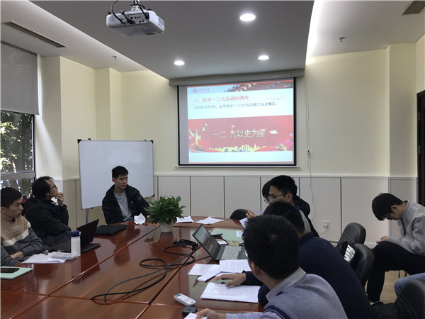 會(huì)議第二個(gè)環(huán)節(jié)是紀(jì)念一二九運(yùn)動(dòng)84周年。1935年12月9日,北平各大中學(xué)校的愛國(guó)學(xué)生6000余人涌上街頭,向國(guó)民政府軍政部長(zhǎng)何應(yīng)欽請(qǐng)?jiān)福髧?guó)民黨當(dāng)局停止內(nèi)戰(zhàn),聯(lián)合抗日,打倒日本帝國(guó)主義。支部書記帶大家重溫那一段歲月,號(hào)召大家向一二九抗日救亡運(yùn)動(dòng)的熱血青年學(xué)生們學(xué)習(xí),以史為鑒,發(fā)揚(yáng)愛國(guó)注意精神,展現(xiàn)當(dāng)代大學(xué)生黨員的擔(dān)當(dāng)。