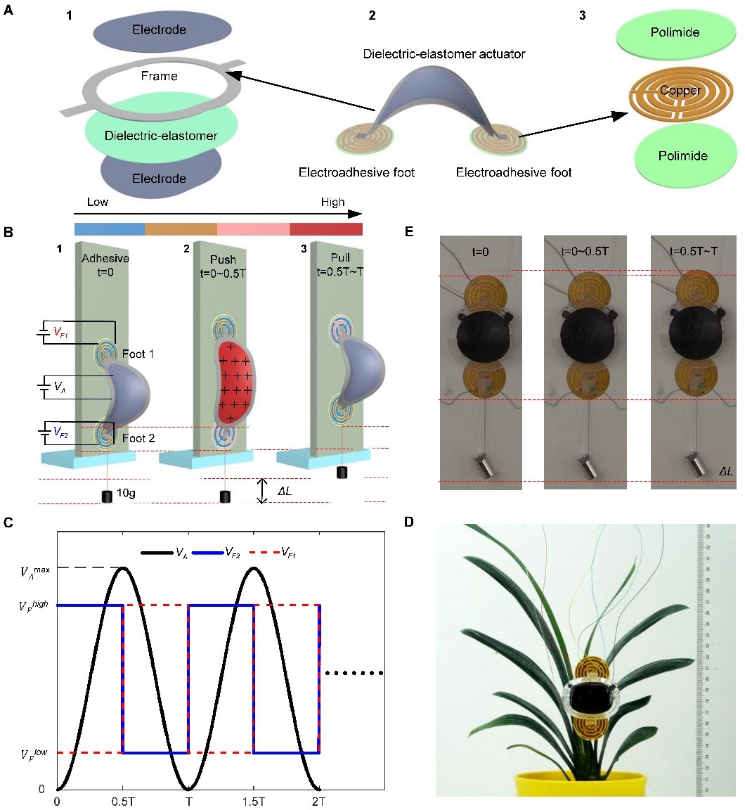 軟體爬壁機(jī)器人的設(shè)計和工作原理:(A)結(jié)構(gòu)設(shè)計;(B)爬壁原理;(C)協(xié)同控制策略;(D)玻璃爬壁實驗示意;(E)帶10g負(fù)載爬壁實驗示意。