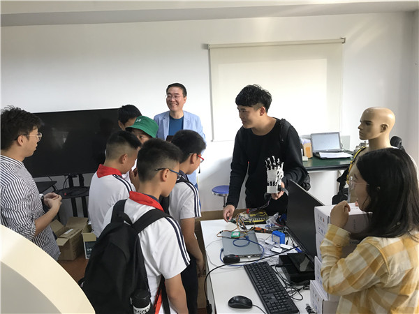 在生物機(jī)器人實(shí)驗(yàn)室,開放參觀的有手功能康復(fù)外骨骼系統(tǒng)、功能性電刺激系統(tǒng)、基于超聲信號的手勢識別系統(tǒng)等項(xiàng)目。黨支部劉勝杰、吉斌用淺顯易懂的語言介紹項(xiàng)目的基本原理、應(yīng)用場景,并進(jìn)行了實(shí)物演示,七寶實(shí)驗(yàn)中學(xué)的孩子們還體驗(yàn)了功能性電刺激系統(tǒng),感受到現(xiàn)代科技設(shè)備的進(jìn)步,孩子們驚嘆原來“鋼鐵俠在未來也不再是虛幻”。
