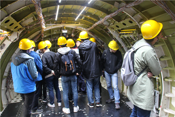 通過參觀飛機(jī)機(jī)身強(qiáng)度檢測的靜力試驗(yàn)室,同學(xué)們了解了飛機(jī)全機(jī)身靜力檢測的基本原理、工作流程、技術(shù)難點(diǎn)以及過往經(jīng)驗(yàn),接待人員還帶領(lǐng)同學(xué)們走進(jìn)了一架裝有檢測儀器的裸機(jī)的內(nèi)部,讓同學(xué)們零距離親身體驗(yàn)靜力檢測技術(shù)的精細(xì)與巧妙,面對(duì)著精巧設(shè)計(jì)的檢測裝置,同學(xué)們嘖嘖稱奇。在愉悅的氛圍中,參觀師生結(jié)束了這趟科研參觀旅程。