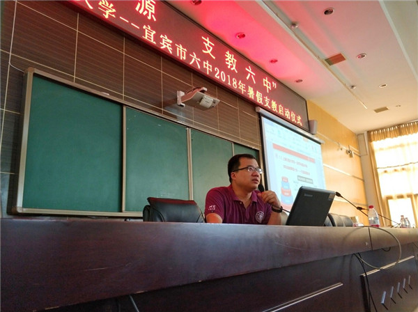 14日上午,“飲水思源,支教六中”支教啟動儀式在宜賓六中明德講堂舉行,宜賓六中副校長馮貴友、學(xué)生發(fā)展中心主任蔡明、高一年級主任鄧文娟、各年級教師以及90多名學(xué)生,顧希垚老師及支教團全體成員出席啟動儀式。馮貴友致歡迎辭,他指出,“我住長江頭,君住長江尾”,上海交大與宜賓六中的友誼源遠流長,上海交通大學(xué)校長林忠欽院士是宜賓六中的知名校友,多年來心系母校發(fā)展,他代表宜賓六中對上海交大代表團的到來表示歡迎。顧希垚表示,支教團是“因為一群人,愛上一座城”,正是因為六中這群可愛的老師和同學(xué),使“萬里長江第一城”的宜賓更加美麗動人,讓人流連忘返。顧希垚提出了兩點希望:第一,希望以支教活動為契機,建立起溝通紐帶,拉近兩校距離,讓六中與交大同呼吸、共命運;第二,希望支教團成員深入了解宜賓六中,了解中西部地區(qū)的教育發(fā)展,引導(dǎo)同學(xué)們樹立“扎根西部、服務(wù)西部”的意識。蔡明做最后總結(jié),希望宜賓六中的同學(xué)能夠養(yǎng)成“專注、思考、實踐”的學(xué)習(xí)習(xí)慣,在活動中有所收獲。