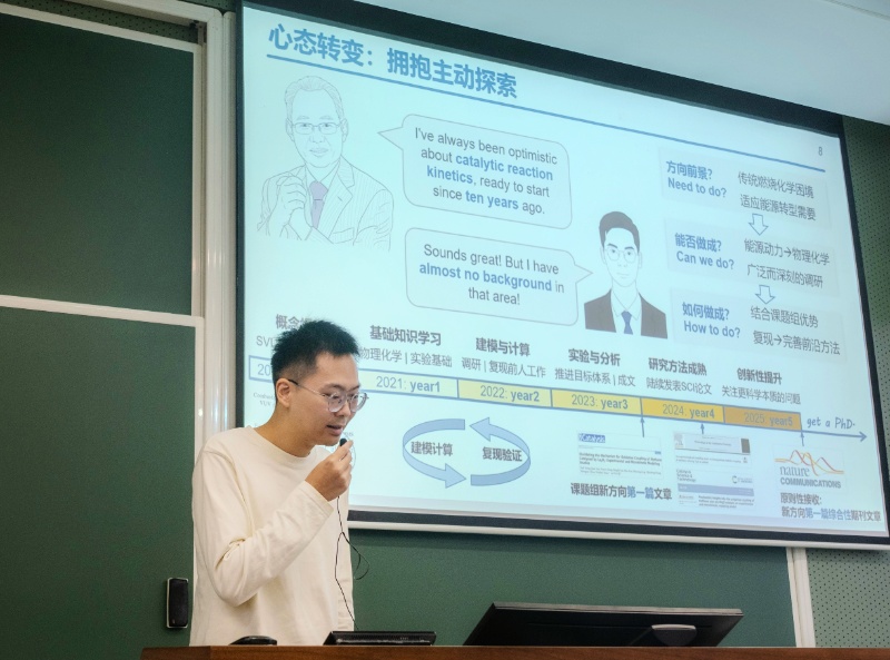 在經(jīng)驗分享環(huán)節(jié),優(yōu)秀學長熊再立、黃哲作主題分享。熊再立結(jié)合自身科研經(jīng)歷,建議同學們從“是否值得——能否完成——如何完成”三個維度做好課題規(guī)劃,并介紹了常用科研軟件與時間管理方法。黃哲則圍繞具體科研課題實踐,分別從“如何做科研”“如何寫論文”“如何做匯報”交流了攻關(guān)體會與實操要點。