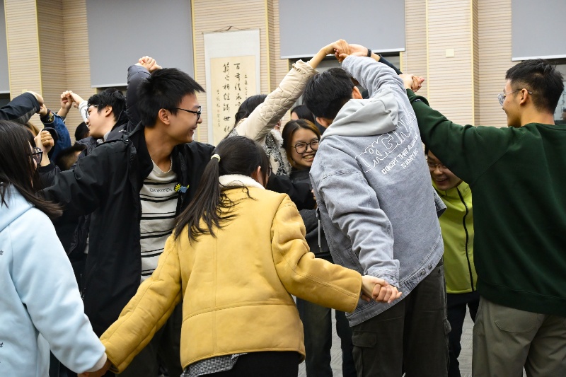 團體活動中,胡文婷組織開展“大風吹”、“最快排隊”等熱身游戲,現(xiàn)場氣氛迅速升溫。在隨后的“人體多米諾”活動中,同學們圍圈而坐,彼此支撐,在默契配合中成功完成旋轉挑戰(zhàn),將現(xiàn)場氣氛推向高潮。