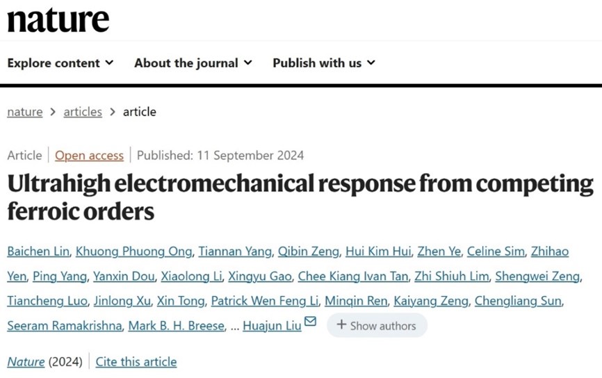 9月11日,機械與動力工程學院前瞻交叉研究中心楊天南副教授在Nature上發(fā)表題為“Ultrahigh electromechanical response from competing ferroic orders”的研究論文,提出了基于極化序構競爭的機電耦合材料設計策略,通過構建反鐵電與鐵電相共存,增強電場誘導的晶格序構響應,實現(xiàn)材料壓電性顯著提高。楊天南副教授為共同第一作者,另兩位共同第一作者為新加坡科技研究局/新加坡南洋理工大學博士生林柏臣、新加坡科技研究局Khuong Phuong Ong研究員,通訊作者為新加坡南洋理工大學Yeng Ming Lam教授與新加坡科技研究局劉華俊研究員。
