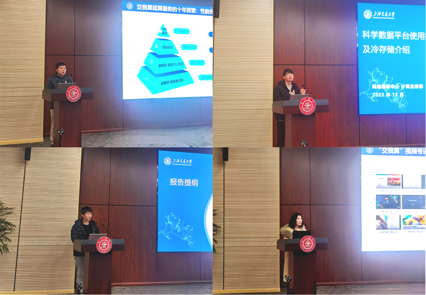 主題報告環(huán)節(jié),林新華從整體上介紹了“交我算”平臺的發(fā)展歷程和現(xiàn)狀,包括“交我算”計算資源、服務(wù)團(tuán)隊與模式以及對全校科研創(chuàng)新的支撐等,重點展示了機(jī)械動力學(xué)院用戶的計算現(xiàn)狀概覽。文敏華結(jié)合多個不同學(xué)科的案例,展示了“交我算”學(xué)科融合和代碼優(yōu)化服務(wù)的顯著成果。李瑞介紹了工程計算中的AI4S案例分享,重點介紹了如何將機(jī)器學(xué)習(xí)和深度學(xué)習(xí)模型應(yīng)用于傳統(tǒng)的力學(xué)問題求解、化學(xué)物質(zhì)分類中。王星澤圍繞“交我算”新推出的科學(xué)數(shù)據(jù)平臺和冷存儲系統(tǒng),重點介紹了科學(xué)數(shù)據(jù)平臺的基本功能、使用方法以及冷存儲系統(tǒng)使用指南等知識。于瀟雪對“交我算”的教學(xué)支撐服務(wù)進(jìn)行了介紹,包括免費申請相關(guān)課程計算資源、計算融合課程的開設(shè)等內(nèi)容。