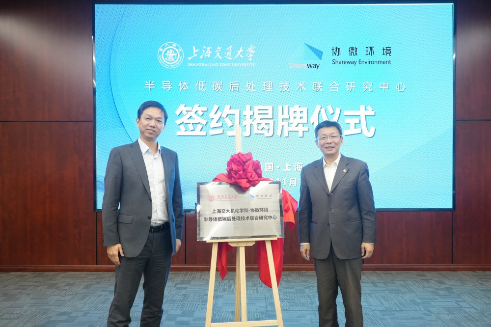 李玉陽與Kirel Tang共同簽署《共建上海交通大學(xué)機(jī)械與動(dòng)力工程學(xué)院—協(xié)微環(huán)境半導(dǎo)體低碳后處理技術(shù)聯(lián)合研究中心協(xié)議》,杜朝輝與車薛東共同為聯(lián)合研究中心揭牌。