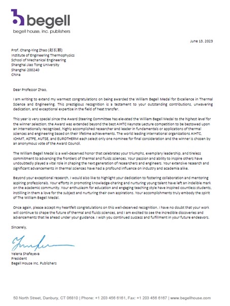 近日,傳熱及熱科學(xué)領(lǐng)域享有盛譽(yù)的國(guó)際最高獎(jiǎng)項(xiàng)之一威廉·貝格爾獎(jiǎng)?wù)拢╓illiam Begell Medal For Excellence in Thermal Science and Engineering based on lifetime achievements)正式揭曉,上海交通大學(xué)機(jī)械與動(dòng)力工程學(xué)院趙長(zhǎng)穎教授因在微納尺度傳熱、熱輻射、多孔介質(zhì)傳熱及高效儲(chǔ)熱等熱科學(xué)領(lǐng)域做出的杰出貢獻(xiàn)獲此殊榮。頒獎(jiǎng)典禮將于8月份在南非開普敦舉辦的第17屆國(guó)際傳熱大會(huì)上舉行,趙長(zhǎng)穎教授將做William Begell Medal Award Lecture大會(huì)主旨報(bào)告。