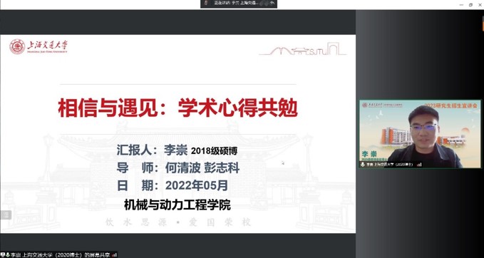 機械與動力工程學院2023年研究生優(yōu)秀生源選拔與致遠榮譽計劃夏令營活動已于5月20日正式啟動報名,招生微信推送閱讀量達7565人次,獲得了高度關(guān)注。本次招生宣講會分為騰訊會議主會場和直播同步進行,主會場邀請了來自60余所高校的300余名學子參會,直播平臺吸引了200余人次觀看。近年來,為適應(yīng)常態(tài)化疫情防控要求,學院結(jié)合以往線下實地宣講和“互聯(lián)網(wǎng)+”新技術(shù)的優(yōu)勢,主動搭建線上宣講互動平臺,連續(xù)3年與廣大學子“云上赴約”,不讓疫情阻斷每一位英才“擇良機動,砥礪遠行”的夢想。歡迎廣大學子積極報考上海交大機械與動力工程學院。