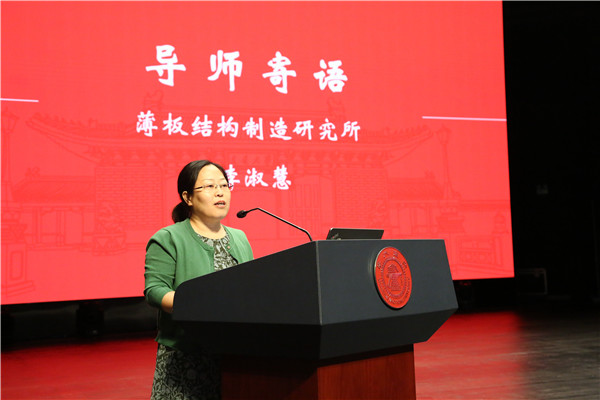 薄板結(jié)構(gòu)制造研究所李淑慧教授作為導(dǎo)師代表發(fā)言,以“從做題到做事與做人”為主題,勉勵(lì)同學(xué)們?cè)诳蒲兄飞弦袊?yán)謹(jǐn)?shù)目茖W(xué)思維、發(fā)散的工程思維和橫向思維,還要高度重視細(xì)節(jié)、端正態(tài)度。
