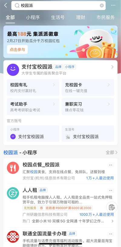 步驟一:支付寶首頁(yè)搜索校園派,點(diǎn)擊“充校園卡”