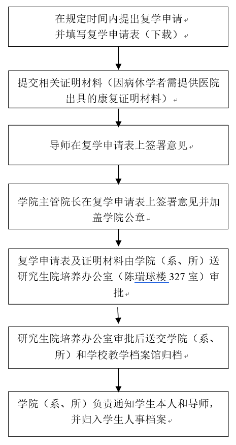 研究生休學(xué)期滿要求復(fù)學(xué)者,需填寫《上海交通大學(xué)研究生復(fù)學(xué)審批表》,經(jīng)學(xué)院(系、所)分管院長審核同意,報(bào)研究生院批準(zhǔn)后辦理復(fù)學(xué)手續(xù)。