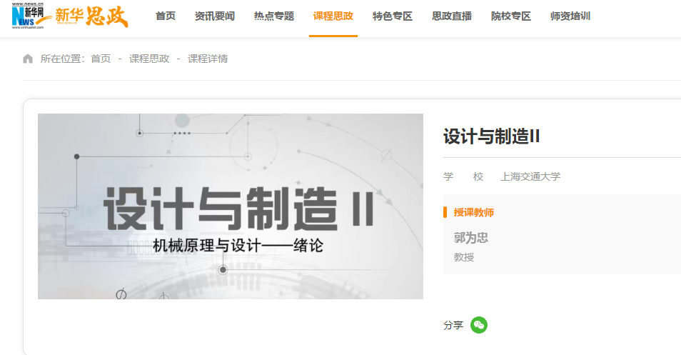 近日,教育部課程思政示范項(xiàng)目名單公布,我院郭為忠教授負(fù)責(zé)的《設(shè)計(jì)與制造Ⅱ》獲評(píng)課程思政示范課程。此次上海交大共有2門課程獲評(píng)。