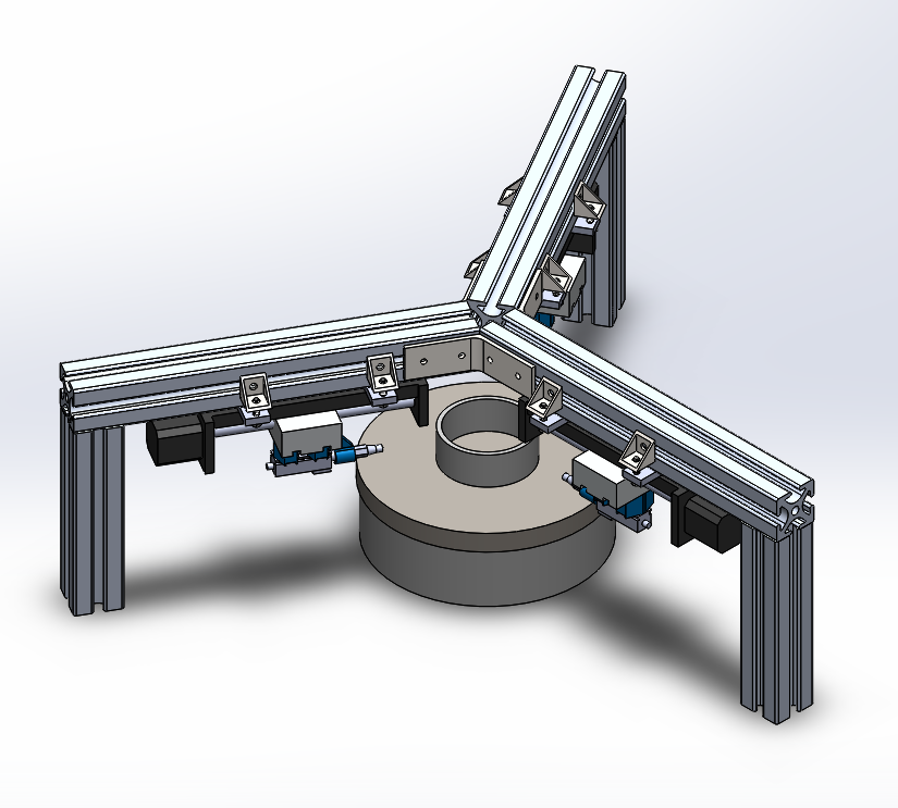 中美兩國項(xiàng)目組成員通力合作,完成了對定心結(jié)構(gòu)的專利及同類產(chǎn)品的檢索分析,提出多個(gè)概念設(shè)計(jì)方案;經(jīng)過和指導(dǎo)老師與企業(yè)工程師的溝通反饋,確定了詳細(xì)的設(shè)計(jì)方向;雙方確定設(shè)計(jì)尺寸與傳感器位置后,建立初步3D模型;對方公司提供生產(chǎn)過程中運(yùn)用的磁性旋轉(zhuǎn)平臺(tái);隨后在收到裝配材料后又對模型設(shè)計(jì)作出修改,并使用3D打印機(jī)加工部分連接件,做出ALPHA原型機(jī);最后使用Arduino接收距離傳感器信號(hào),運(yùn)用定心算法控制步進(jìn)電機(jī)運(yùn)動(dòng)步數(shù),將軸承置于磁性圓盤中心。該設(shè)計(jì)通過多次測試迭代,已達(dá)到企業(yè)的精度與時(shí)間要求。