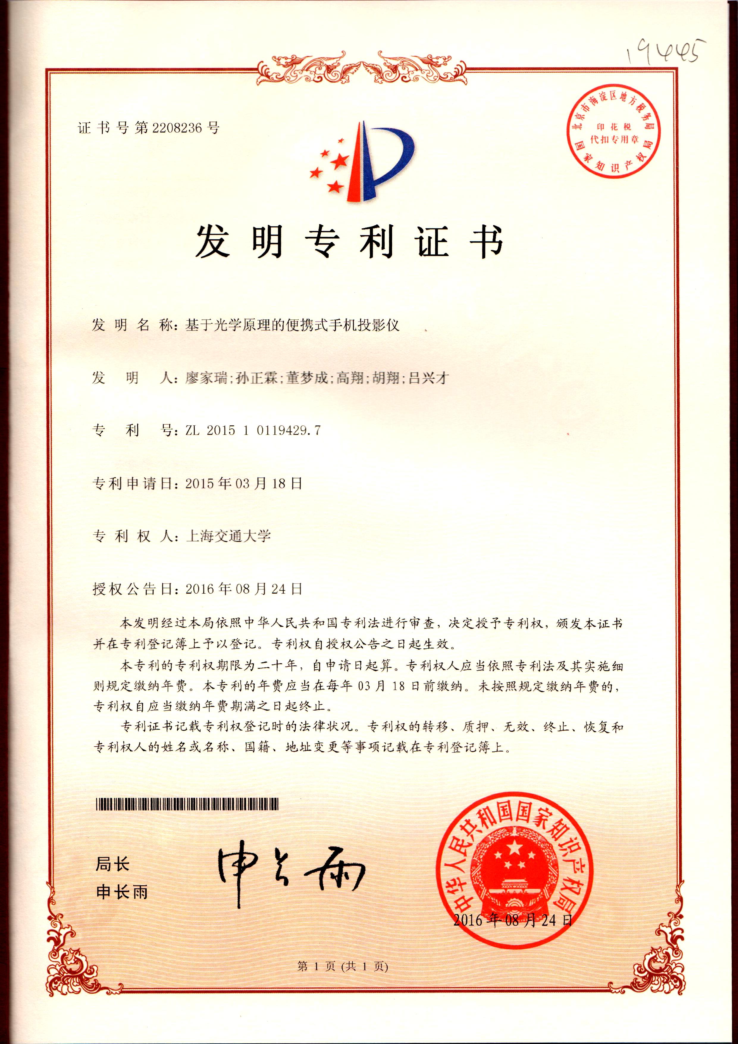 2016年9月14日,由機械與動力工程學院本科生廖家瑞、孫正霖、董夢成、高翔、胡翔申報的發(fā)明項目“基于光學原理的便攜式手機投影儀”獲得國家發(fā)明專利(專利號: ZL 2015 1 0119429.7)。