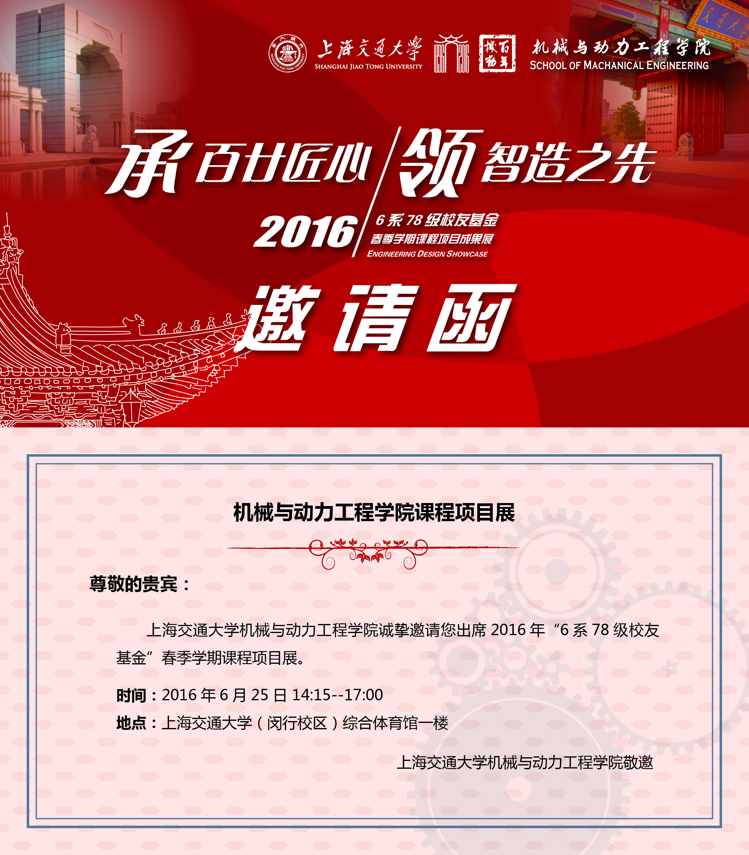2012-2016年,學(xué)院已成功舉辦了五屆項(xiàng)目成果展。為進(jìn)一步推進(jìn)校企產(chǎn)學(xué)結(jié)合的工程教育模式改革,提升學(xué)生的創(chuàng)新意識(shí)和綜合工程能力,此次2016年春季學(xué)期課程項(xiàng)目成果展圍繞“承百廿匠心 領(lǐng)智造之先”的主題,展示學(xué)生創(chuàng)新思維與校企產(chǎn)學(xué)合作的工程教育模式改革成果。本屆課程項(xiàng)目成果展還得到了機(jī)械與動(dòng)力工程學(xué)院“6系78級(jí)飲水思源校友基金”的大力資助。