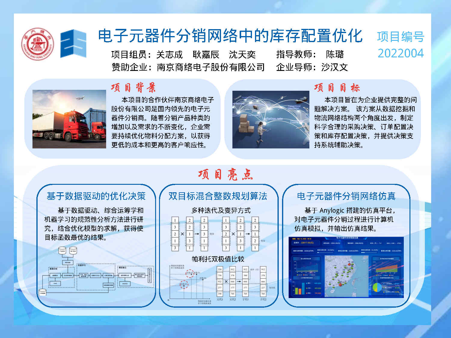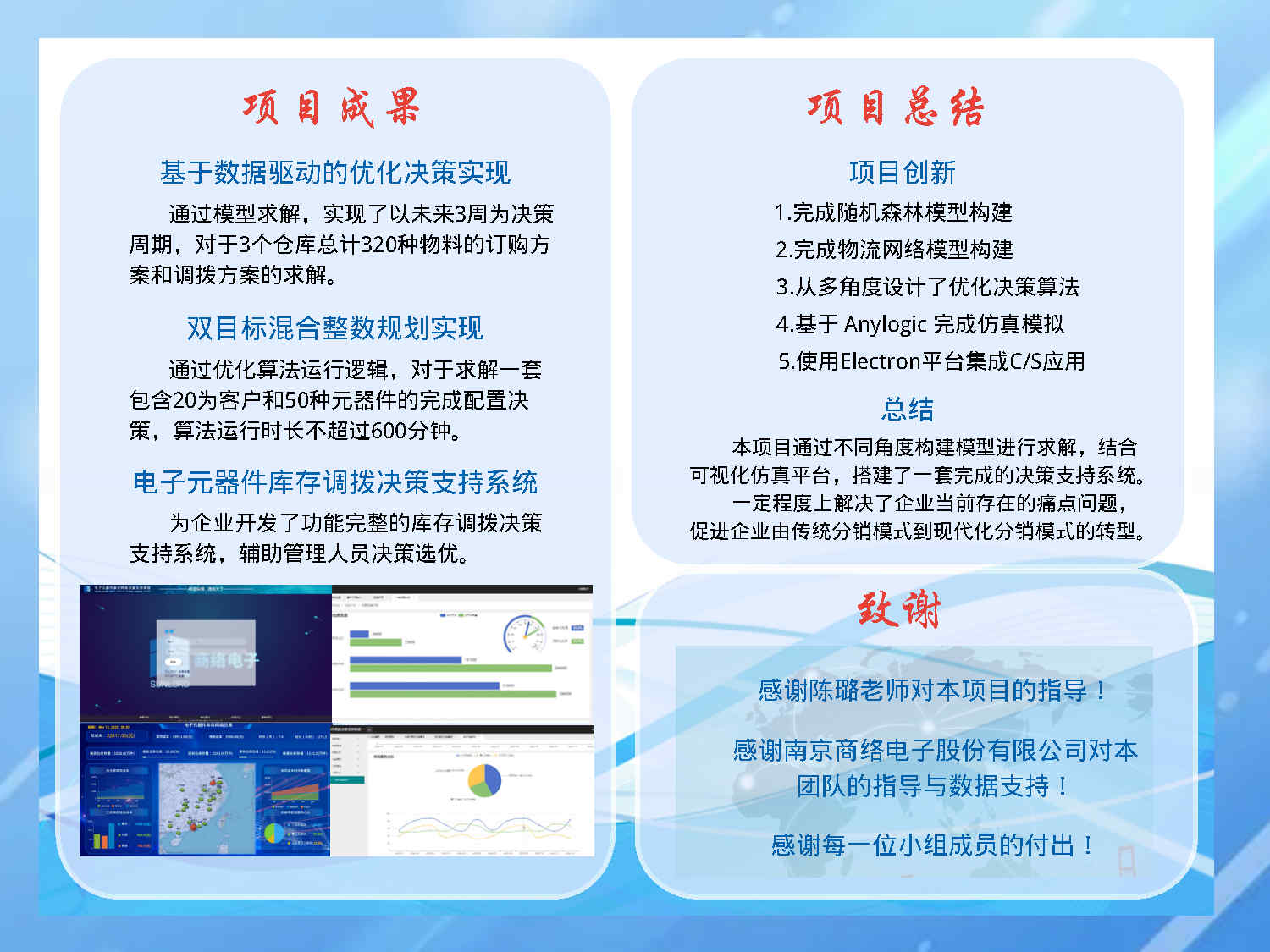 分析南京商絡(luò)電子股份有限公司的分銷業(yè)務(wù),包括供應(yīng)商、倉(cāng)庫(kù)、客戶的性質(zhì)和特點(diǎn),整個(gè)流程的網(wǎng)絡(luò)結(jié)構(gòu),充分挖掘商絡(luò)積累的大量歷史數(shù)據(jù)背后的潛在價(jià)值,結(jié)合倉(cāng)庫(kù)容量和配送價(jià)格等抽象現(xiàn)實(shí)中的約束和限制,通過構(gòu)建數(shù)學(xué)模型、設(shè)計(jì)優(yōu)化算法實(shí)現(xiàn)電子元器件分銷網(wǎng)絡(luò)的庫(kù)存配置優(yōu)化,制定具體的庫(kù)存分配、庫(kù)存調(diào)撥、庫(kù)存配送的決策方案。此外,為了便于業(yè)務(wù)人員的使用,通過功能分析、需求拆解,設(shè)計(jì)用戶友好、容易上手的決策支持系統(tǒng)加以封裝,可視化地輸出決策方案和展示決策效果。