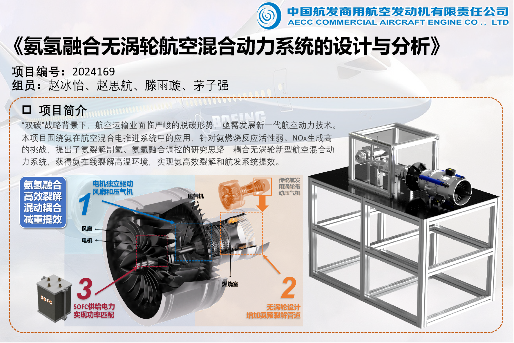 “雙碳”戰(zhàn)略背景下,航空運輸業(yè)面臨嚴峻的脫碳形勢,亟需發(fā)展新一代航空動力技術(shù)。氫能化和電氣化是航空業(yè)脫碳主要路徑,而全氫航空動力面臨燃氫儲氫兩大挑戰(zhàn)。氨因其高儲氫效率已成為重要零碳燃料,同時具有儲運成本低、泄露易察覺等優(yōu)勢。此外,動力電池能量密度低、功率密度低,導致全電動力無法滿足長航程需求,渦-電混動技術(shù)被認為更為可行。本項目圍繞氨在航空混合電推進系統(tǒng)中的應用,針對氨燃燒反應活性弱、NOx生成高的挑戰(zhàn),提出了氨裂解制氫、氨氫融合調(diào)控的研究思路,耦合無渦輪新型航空混合動力系統(tǒng),獲得氨在線裂解高溫環(huán)境,實現(xiàn)氨高效裂解和航發(fā)系統(tǒng)提效。