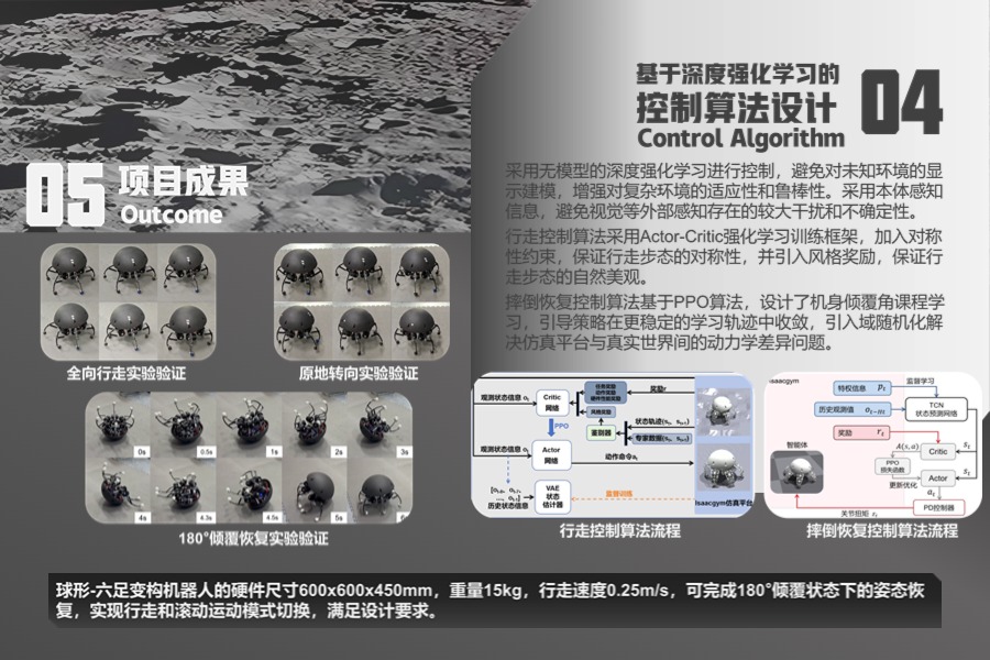 本項(xiàng)目聚焦于研發(fā)一款具備六足爬行與球形滾動(dòng)復(fù)合移動(dòng)能力的創(chuàng)新型機(jī)器人,首先需完成多模式運(yùn)動(dòng)機(jī)構(gòu)設(shè)計(jì):構(gòu)建可切換爬行與滾動(dòng)形態(tài)的六足本體結(jié)構(gòu),通過(guò)關(guān)節(jié)聯(lián)動(dòng)機(jī)構(gòu)實(shí)現(xiàn)足式支撐與球體閉合的形態(tài)轉(zhuǎn)換,兼顧足式運(yùn)動(dòng)的越障靈活性與球形滾動(dòng)的高效移動(dòng)特性。同步進(jìn)行虛擬仿真與驗(yàn)證:利用多體動(dòng)力學(xué)軟件建立機(jī)器人虛擬模型,仿真不同地形下的運(yùn)動(dòng)軌跡、能耗特性及穩(wěn)定性,優(yōu)化機(jī)構(gòu)參數(shù)與控制邏輯。最終需完成物理樣機(jī)研制與實(shí)驗(yàn):集成輕量化機(jī)身、低功耗驅(qū)動(dòng)模塊與自主控制軟件,驗(yàn)證復(fù)合移動(dòng)模式的可靠性。