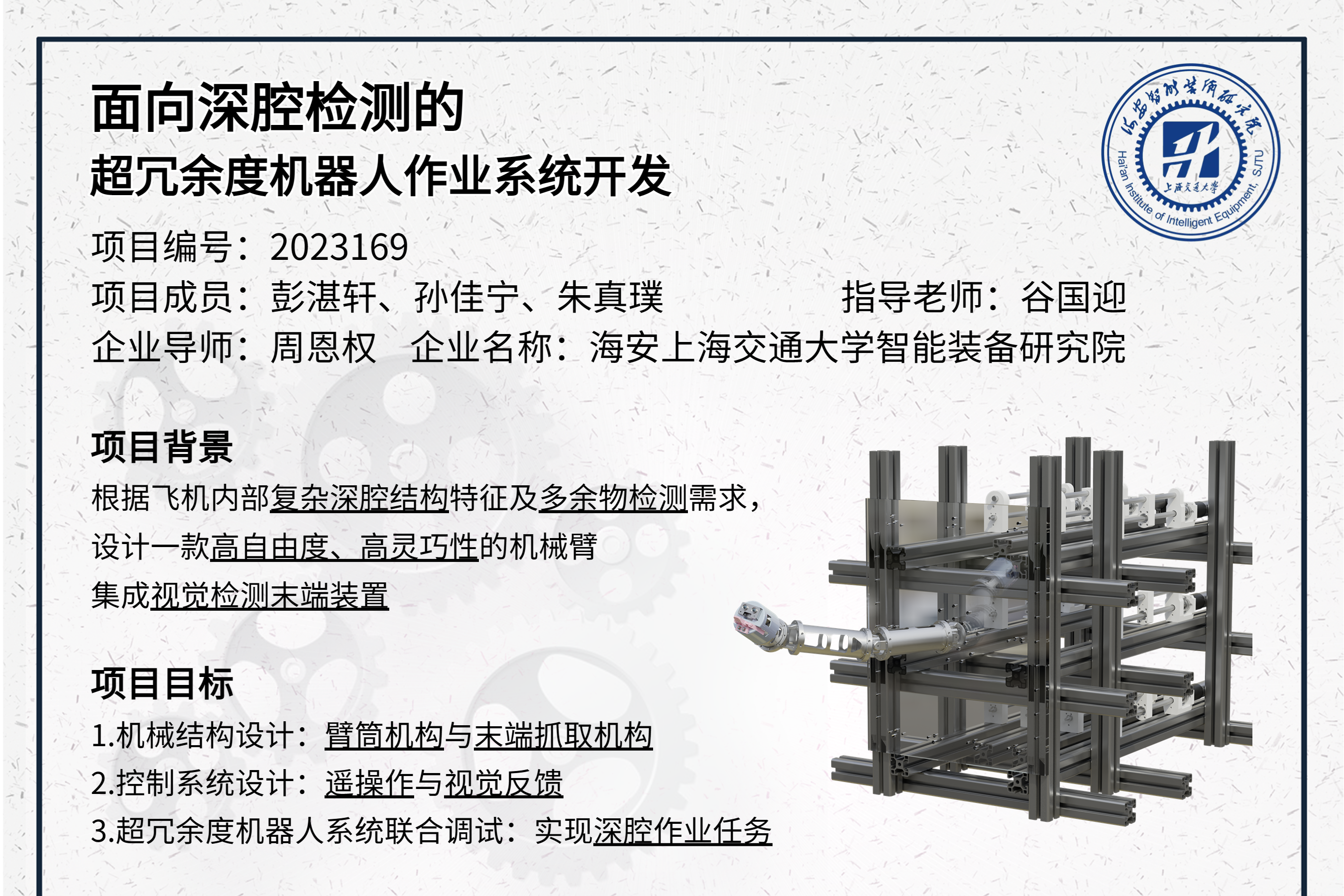 在飛機制造和裝配復雜深腔構(gòu)件時,易產(chǎn)生切屑、螺釘?shù)榷嘤辔铮瑢\行安全構(gòu)成威脅。每年因多余物導致的飛機故障約占故障總數(shù)的1.5%左右,成為低層次質(zhì)量事故的重要原因。但由于深腔結(jié)構(gòu)復雜、狹窄、弱/無光、封閉、多障礙的特點,傳統(tǒng)工業(yè)機器人無法進入,難以對多余物進行檢測。因此,需要一種高自由度、高靈巧性的機器人系統(tǒng),能夠檢測和拾取在深腔結(jié)構(gòu)中的物品。本項目旨在開發(fā)這樣的超冗余度機器人系統(tǒng),以實現(xiàn)深腔環(huán)境的檢測和多余物拾取。
