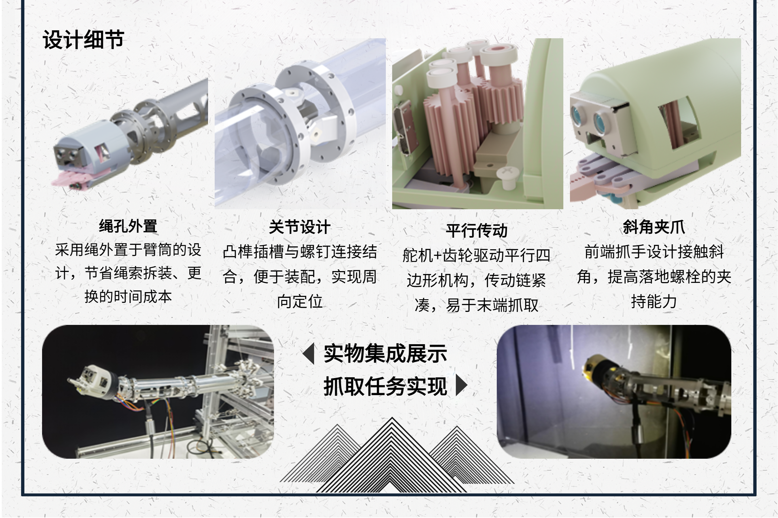本項目工作主要分為機械臂臂筒機構(gòu)優(yōu)化設(shè)計、末端抓取機構(gòu)與視覺傳感系統(tǒng)的集成、以及驅(qū)動裝置與控制系統(tǒng)開發(fā)三個部分,并進行整合集成。項目總體設(shè)計目標包括:完成臂筒機構(gòu)設(shè)計,優(yōu)化已有蛇形機械臂的驅(qū)動性能;完成末端抓取裝置與視覺傳感器的集成化設(shè)計,使蛇形機械臂具備末端狀態(tài)傳感與抓取遺落物的能力;完成驅(qū)動裝置的設(shè)計與控制系統(tǒng)的集成,使蛇形機械臂具有一定的驅(qū)動能力;進行超冗余度機器人系統(tǒng)聯(lián)合調(diào)試,最終實現(xiàn)系統(tǒng)集成和深腔作業(yè)任務(wù)實現(xiàn)。
