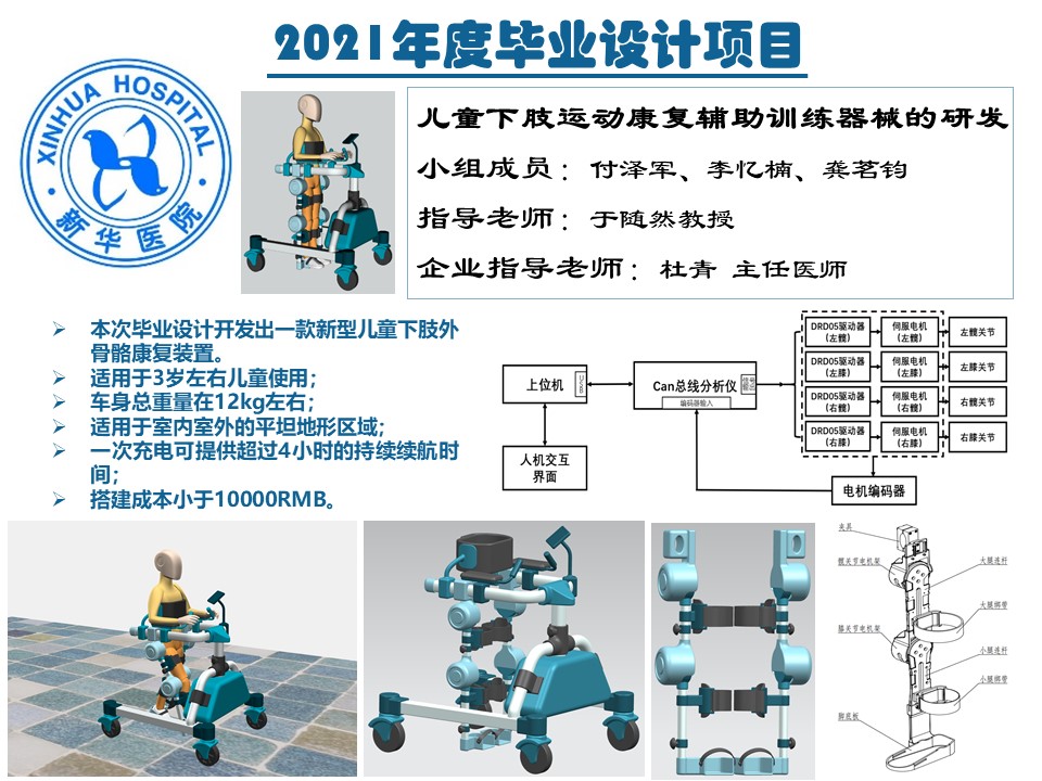 本次畢業(yè)設(shè)計針對我國腦癱兒童早期干預(yù)工作的必要性和迫切性,提出一種面向腦癱兒童下肢運動能力康復(fù)的新型外骨骼輔助方式。從人體工學(xué)的角度出發(fā),設(shè)計了一種移動輔助小車式兒童外骨骼康復(fù)訓(xùn)練器械,開發(fā)了相應(yīng)的控制系統(tǒng)及步態(tài)規(guī)劃仿真軟件,最后完成實物搭建與測試證實該方案的可行性及安全性。
